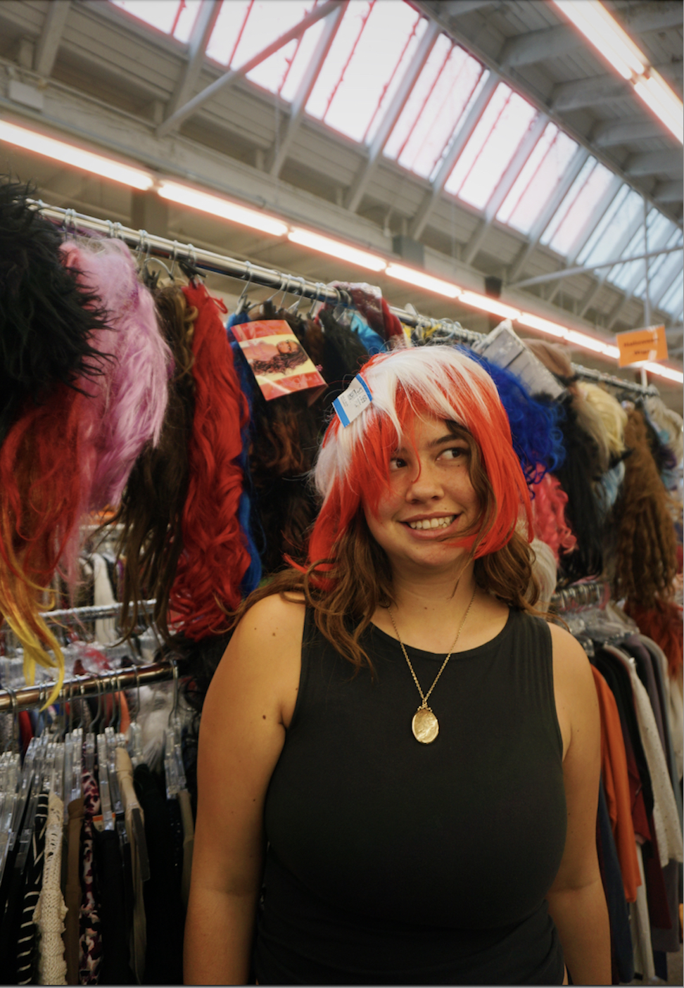 “Funky styles” Here, Kealani sports a funky wig. Fun and unique items like this are plenty at the second-hand store and can be a perfect solution for building a unique style or fitting a niche fashion need, such as a halloween costume, while avoiding the unnecessary waste that comes from garments being purchased, worn once, and then discarded. October 25, 2025. Keira Emes